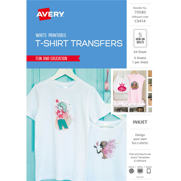 AVERY 70580 C9414 INSPIRED T-SHIRT TRANSFER A4 WHITE PACK 5