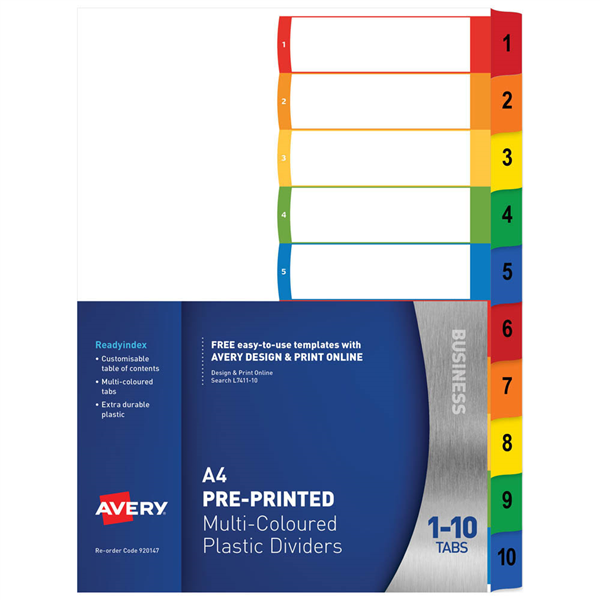 These polypropylene ReadyIndex dividers help you stay organised so you can locate important documents quickly and easily They feature 10 pre-printed, numbered multi-colour tabs as well as a table of contents page you can customise using the free software and templates at www.averyproducts.com.au Once the design is done, simply print it on your laser or inkjet printer Now that's a road map to success Easy design and printing: use Avery templates in Microsoft Word or try Avery software at www.averyproducts.com.au Fast and easy way to create professional indexes Laser or inkjet compatible Ideal when presentation is important