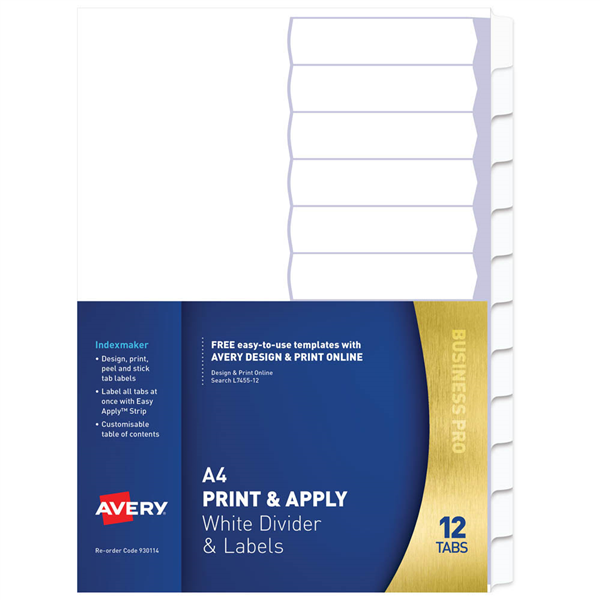 The Easy Apply labels allows you to apply all 12 tab labels at once! And with free templates and software from www.averyproducts.com.au and a laser or inkjet printer, you will have professional-looking printed dividers in minutes Just print, peel and press That's what I call professional reports in a flash! Easy Apply labels allow you to apply all tab labels at once! Simply print, align labels against tabs, smooth down labels and peel up strip Easy design and printing: use Avery templates in Microsoft Word or try Avery software at www.averyproducts.com.au Organise your documents quickly and easily