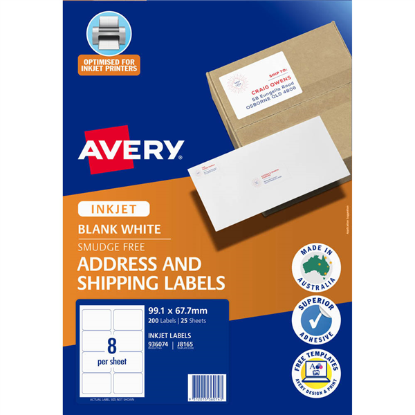 Inkjet label material is optimised for a smudge free professional finish Superior strong adhesive Customise your labels with our free and easy-to-use template software; Avery Design and Print - available at averyproducts.com.au/print Labels made with paper from sourced from sustainable forests