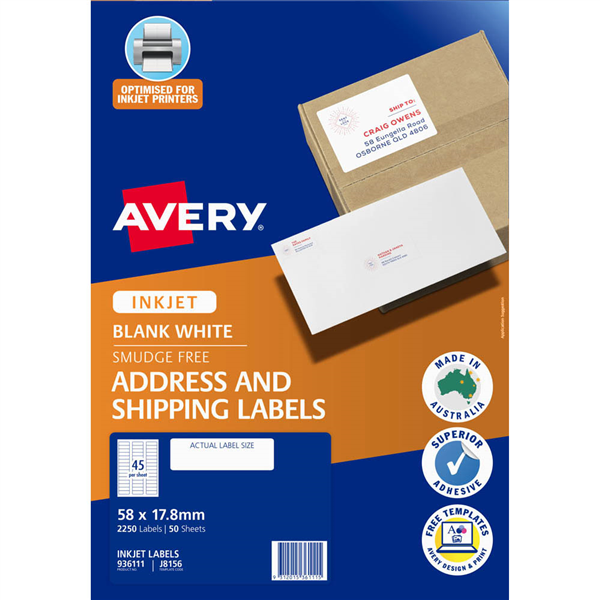 Inkjet label material is optimised for a smudge free professional finish Superior strong adhesive Customise your labels with our free and easy-to-use template software; Avery Design and Print - available at averyproducts.com.au/print Labels made with paper from sourced from sustainable forests