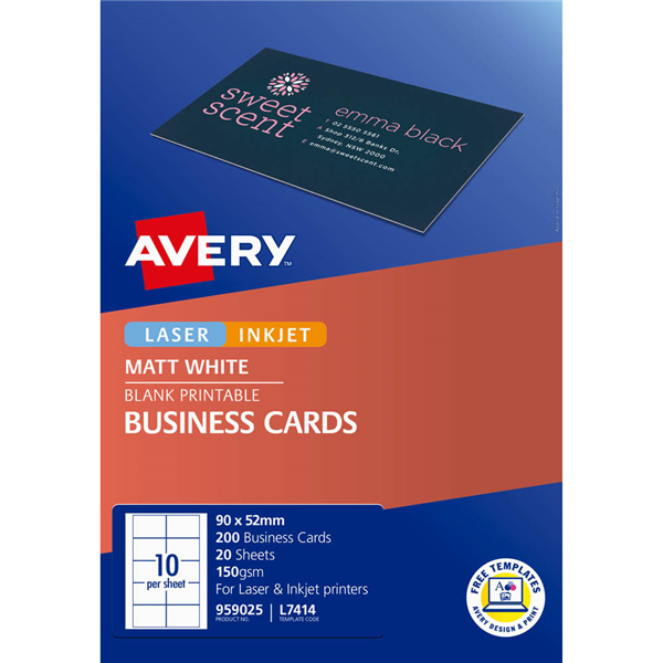 With the bright white, 150gsm card, you can expect nothing less than elegant looking cards printed on your inkjet or laser printer instantly No need to wait for printer lead times, print just as many as you need when you need them Single-sided printable matt white card in a size of 90 x 52mm with 10 cards per sheet in a pack of 20 sheets, perfect for frequent users who need a lot of business cards or for those creating cards for different people in the office Use the Avery Design & Print online to create your business cards. you can find a selection of images and designs ready to use or import your logo and text to create your own and print them on your inkjet or laser printer in minutes. It's never been easier Also great for creating loyalty cards, gift tags, appointment cards and more The sheets are micro-perforated so you can easily separate each business card Perfect for use with Laser and Inkjet printers
