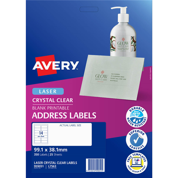 They are incredibly durable (oil, dirt, splash and tear proof), adhering to almost any polished surface These labels are ideal for adding elegance to coloured envelopes, corporate events and wedding invitations You can create custom labels using free Avery software and templates at averyproducts.com.au Made from clear, glossy material and are 100% transparent Ideal for coloured envelopes, wedding invitations and corporate events Made from durable material, which is oil, dirt, splash and tear proof Developed for laser printers and guaranteed Jam Free Customise your labels with free Avery software and templates available at averyproducts.com.au/print