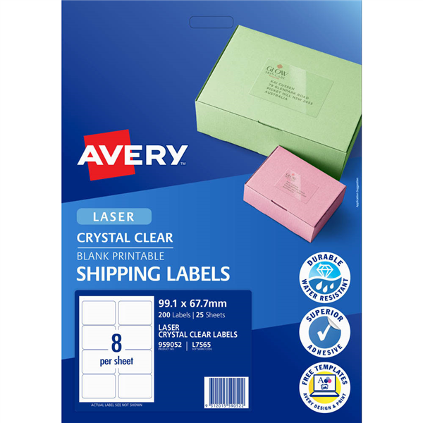 The labels are 100% transparent, so they blend into the background of your parcel or gift They are durable (oil, dirt, splash and tear proof), so your parcel will arrive looking as professional as when it left your door The labels can also be used on glass polished surfaces, plastic or metal surfaces Made from clear, glossy material and are 100% transparent Ideal for elegant parcels, gifts and boxes Made from durable material, which is oil, dirt, splash and tear proof Developed for laser printers and guaranteed Jam Free Customise your labels with free Avery software and templates available at averyproducts.com.au/print