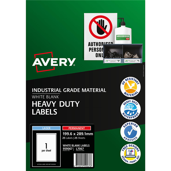 Come rain or shine outdoor signs need to be strong so they don't get damaged by extreme weather conditions Avery Heavy Duty Labels are ideal for outdoors as they are more durable than a normal paper label its cheaper than paying for made to order signs and you can create them as you need them in your office Just design your signs using free software and templates The A4 label gives you the flexibility to use as it is or to cut down to the size you need For more durability than a normal paper label Ideal to mark your property with your contact details, to label products or brochures for sale or display and to create warning signs or instructions Oil and dirt resistant, splash proof, tear proof and unaffected by temperature changes between -20 to + 80 Deg C UV-resistant, water-resistant and weatherproof Suitable for B/W and colour laser printers