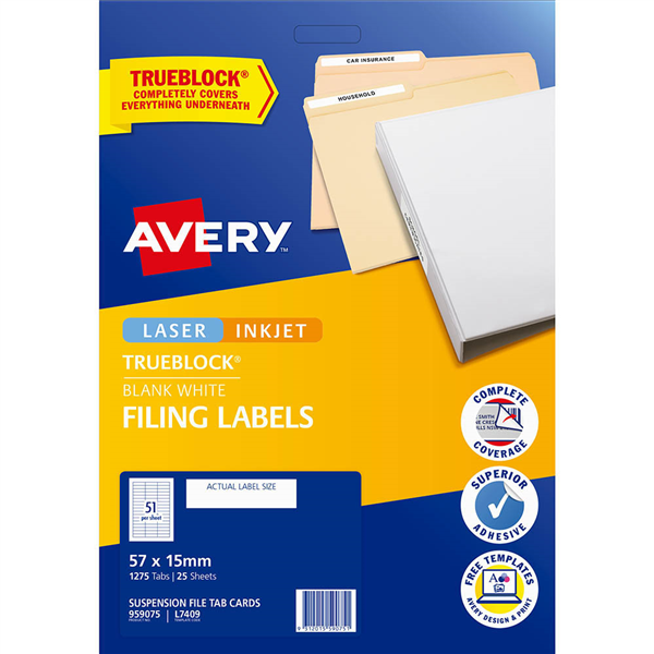 AVERY 959075 L7409 SUSPENSION FILE TAB CARD LABEL PACK 1275