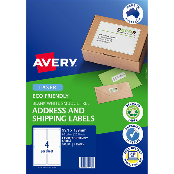 AVERY 959118 L7169EV ECO FRIENDLY LABELS LASER 4UP WHITE PACK 20