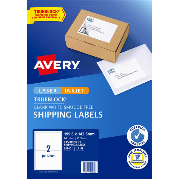 The opaque label covers everything underneath, allowing you to re-use boxes and cartons You can use Avery software to add your company details and recipient details to your labels, creating professional parcels every time TrueBlock technology completely covers everything underneath Ideal for labelling large packages and boxes Design your labels using free Avery software available at averyproducts.com.au Works well with Australia Post, PayPal, eBay and other popular shipping software Labels made with paper from sourced from sustainable forests