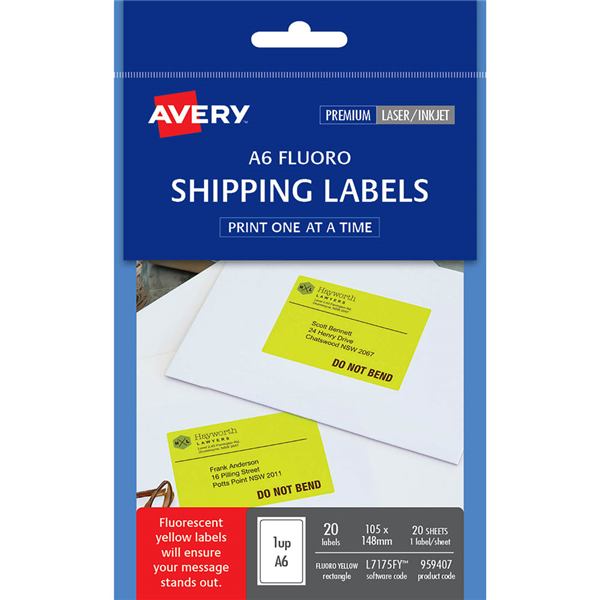 AVERY 959407 L7175 SHIPPING LABEL LASER A6 105 X 148MM YELLOW PACK 25