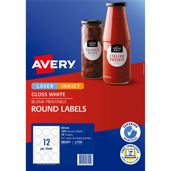 The print-to-the-edge capability lets you apply bold colours and sharp clear text all the way to the edge of the label to vividly market your brand Backed with permanent adhesive, the labels stick to glass, plastic, paper and more, allowing you to make your mark on a wide variety of products You can design your labels with Avery Design and Print Online at averyproducts.com.au Don't just blend in! Get your products noticed Ideal for creating high quality branded labels for your products Print-to-the-edge feature lets you add a full-colour background to your brand logo, product name, address or message Permanent adhesive works on glass, plastic and paper, so it can be used on a variety of product packaging Print labels for your product in the quantity you need, when you need them Customise your labels with free Avery designs in Avery Design and Print Online 120 labels per pack