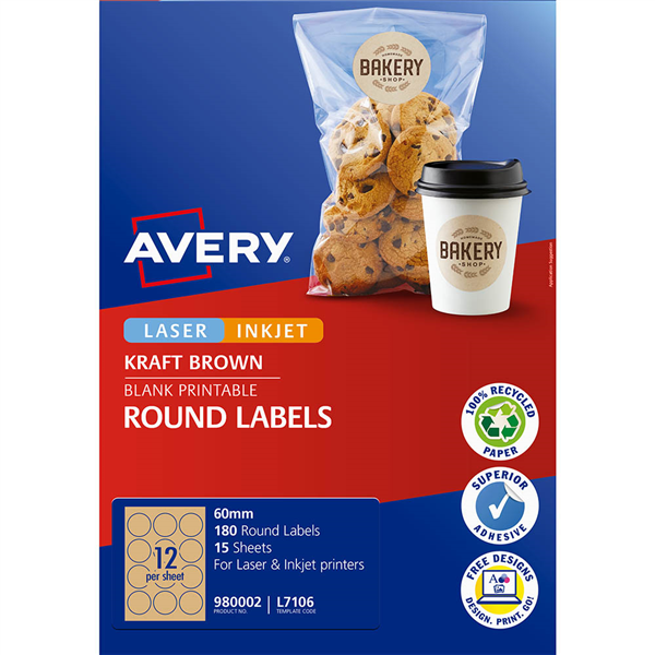 They're perfect for professional-looking labels that blend into brown and kraft boxes and bags The permanent adhesive sticks to glass, plastic and paper, giving you flexibility to label a great range of packaging material With free pre-designed templates in Avery Design and Print Online, you can easily customise the labels with your branding Ideal for creating high quality branded labels for your products Labels can blend into the background of kraft or brown product packaging Print-to-the-edge feature lets you create a custom look using the whole label Permanent adhesive works on glass, plastic and paper, so it can be used on a variety of product packaging Customise your labels with free Avery designs in Avery Design and Print Online
