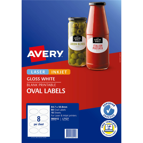 Apply bold colours and sharp, clear text to the label to vividly showcase your brand or business The permanent adhesive sticks to glass, plastic, paper and more, allowing you to put your mark on nearly any product With free software and templates you can easily design and print your own product labels These premium-looking labels are a perfect way to get your product noticed The glossy finish gives products, packaging and your brand a premium look and feel Larger oval size gives you more room to make your brand stand out Permanent adhesive is perfect for glass, plastic, paper and more Create custom product labels using free Avery software and templates