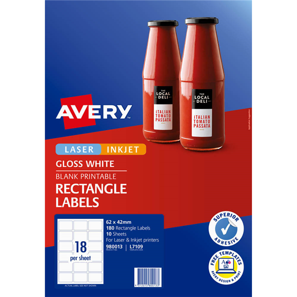AVERY 980013 L7109 BLANK PRINTABLE LABELS RECTANGLE LASER/INKJET 18UP GLOSSY WHITE PACK 10