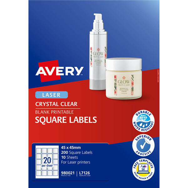 Avery Crystal Clear Square Product Labels let you create professionally branded products directly from your printer