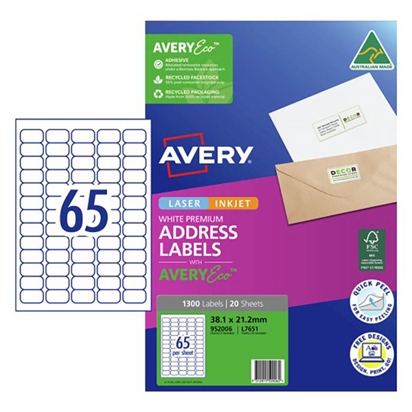 AVERY PREMIUM SHIPPING LABELS WITH AVERYECO 65UP WHITE 20 SHEETS