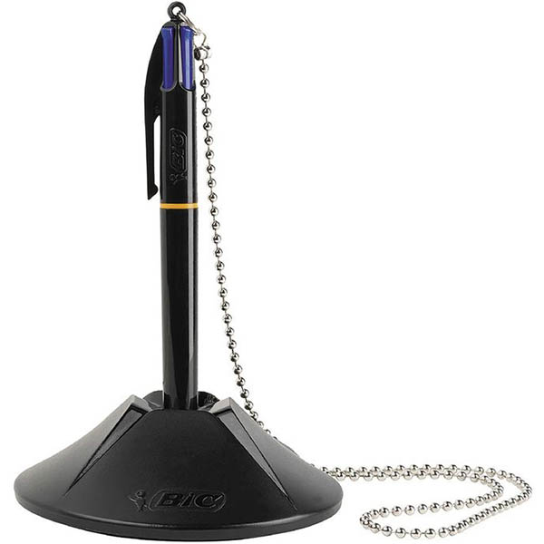 The Bic 4 Colours captive pen has a medium nib which is refillable and is ideal for desks and counters Long lasting as it contains 4 blue inks cartridges Good stability using a weighted base Chain has a 58cm reach capacity Repositionable sticker and secure chain Average total writing length of 8,000m Accredited with NF 400 Writing Instruments ecolabel Recycled plastic base