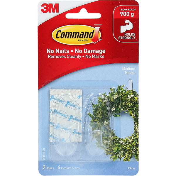 Damage-free hanging Holds strongly and removes cleanly Easy to apply and remove Command Clear Adhesive Strip, holds strongly on a variety of surfaces, including paint, wood, tile and more Great for hanging hats, scarves and other items Contains 2 medium hooks, 4 medium strips