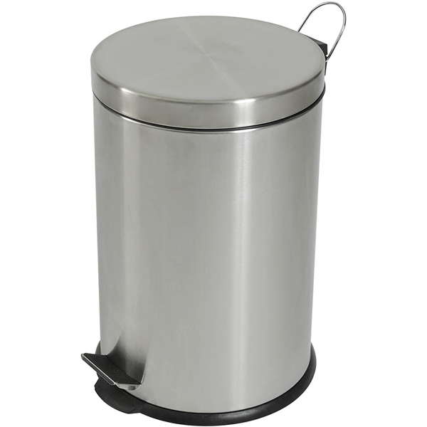 Includes plastic liner and carry handle Rubber pad on foot pedal and base Brushed finish 18/0 stainless steel