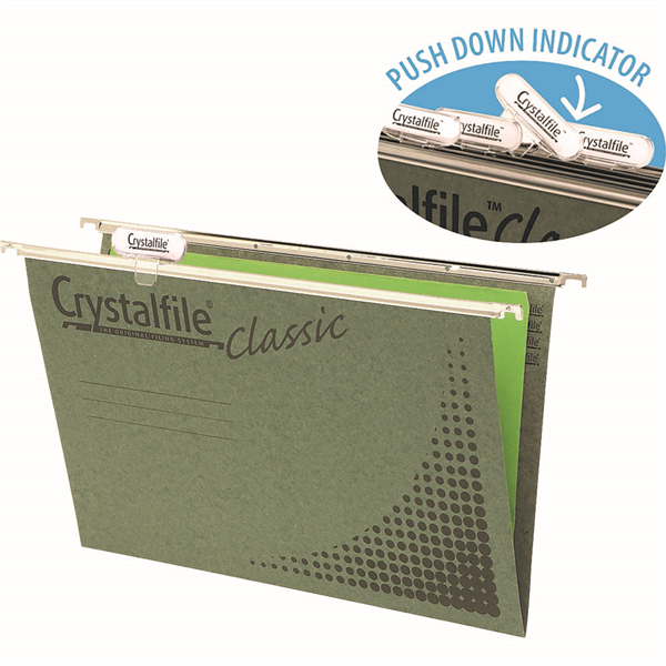 Made from manilla board and smooth nylon runners, they are the ideal choice for your suspension filing needs Made from quality manilla board Made from 100% recycled board and is 100% recyclable Nylon runners ensure smooth, quiet gliding of suspension files Pre-Punched and ready to use with Crystalfile file fasteners Suitable for filing cabinets, desk drawer chassis and desk top organisers Ideal for long term use Includes tabs and inserts Includes tabs and inserts