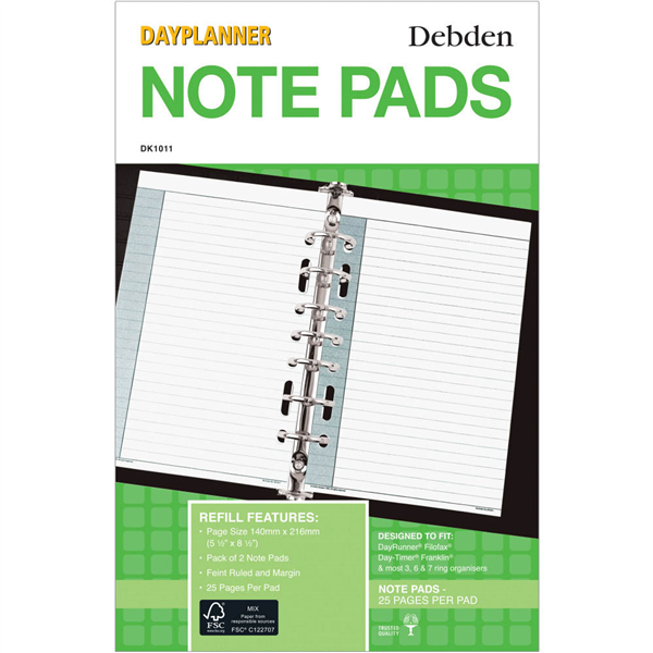 Pre-punched with reinforced holes so that it will also fit into a 7-ring binder Lined pages to keep you writing neatly and consistently Debden offer an extensive range of organiser refills, printed in two colours on quality white paper All Debden DayPlanner refills have universal hole punching to fit most organisers Reinforced holes to prevent breakages and tears Pack of 2 notepad refills Feint ruled and margin 25 sheets per pad