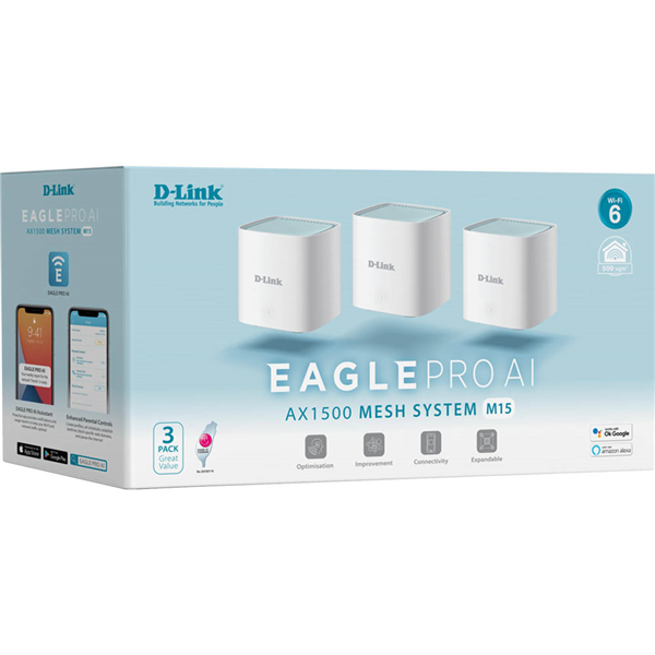 AX1500 Wi-Fi 6 - Ideal for 4K streaming, VR gaming, video calling, and keeping all your Smart Home devices connected AI Convenience - Easily turn on or off the intelligence that conveniently improves and optimises your network automatically Parental Controls - Provide a safe experience for your family with controls for website blocking, setting schedules and guest logins Efficient Connectivity - 4 simultaneous streams, 1024 QAM, BSS-colouring and MU-MIMO ensure you'll always have the best connection quality possible OFDMA - Small data packets destined for multiple devices are transmitted together and never have to queue up again. Perfect for bandwidth-hungry devices battling for bandwidth Wi-Fi Security - The latest WPA3 wireless encryption, and compliant with IEC 62443-4-1 to keep your network safe from unauthorised access Easy Setup & Management - D-Link's free EAGLE PRO AI app brings you a personal AI Assistant to help you manage your Wi-Fi, with added voice control through Amazon Alexa and Google Assistant Expandable Coverage - Add E15 Wi-Fi Extenders to build a Smart Mesh network Smarter Than Your Average Mesh Network - With built-in intelligent connectivity technology, the M15 ensures that the fastest speeds are always being automatically delivered to you, so you can load websites & watch videos in a snap. The built-in AI Wi-Fi Optimiser continuously connects you to the best Wi-Fi channel, while AI Traffic Optimiser prioritises your most critical Internet usage for optimal online experience and stability Reaches Further Than Ever Before - Wi-Fi 6 is perfect for Smart Homes where you need flawless connectivity on multiple devices at the same time. And Wi-Fi 6 also provides a strong network that enables the whole family to stream, game or work without worrying about buffering, dropouts or interference A Mesh Network You Can Rely On - Enjoy an AI-optimised Mesh network which automatically detects the optimal channels so you always experience your Internet at its best And unique AI beamforming enhances your Mesh connectivity between each node, for mesh Wi-Fi throughout your home that you can count on Unprecedented Speeds and Efficiency - Increase your network capacity by up to 4x with MU-MIMO, OFDMA, and BSS Colouring to handle more devices on the network with incredible efficiency. Now you can connect multiple devices simultaneously to your Smart Home without worrying about your network Plug In For a Wired Gigabit Connection - With the built-in Gigabit LAN port per node, you can use an Ethernet cable to enjoy a reliable wired connection and interference-free connectivity without dropouts Stay Connected As You Move From Room to Room - D-Link's Smart Roaming technology creates a single seamless network that ensures that your devices are automatically connected to the strongest possible signal, so you'll always have the best connection possible as you move, without having to worry about blackspots and dropout zones Easy to Add More Coverage From apartments to multi-storey houses, backyard patios and garden decks - additional EAGLE PRO AI M15 units provide more Mesh network coverage, giving you seamless high-speed Internet coverage that will eliminate Wi-Fi dead zones in those hard-to-reach areas throughout properties of any size Safeguards Your Privacy and Security For Peace of Mind - Comes with the latest WPA3 wireless security that&?s compliant with CNSA requirements and uses 192-bit encryption, ensuring that you and your privacy are safeguarded from unauthorised access