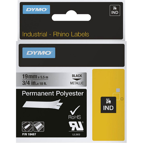 DYMO 18487 RHINO INDUSTRIAL TAPE PERMANENT POLYESTER 19MM BLACK ON METALLIC