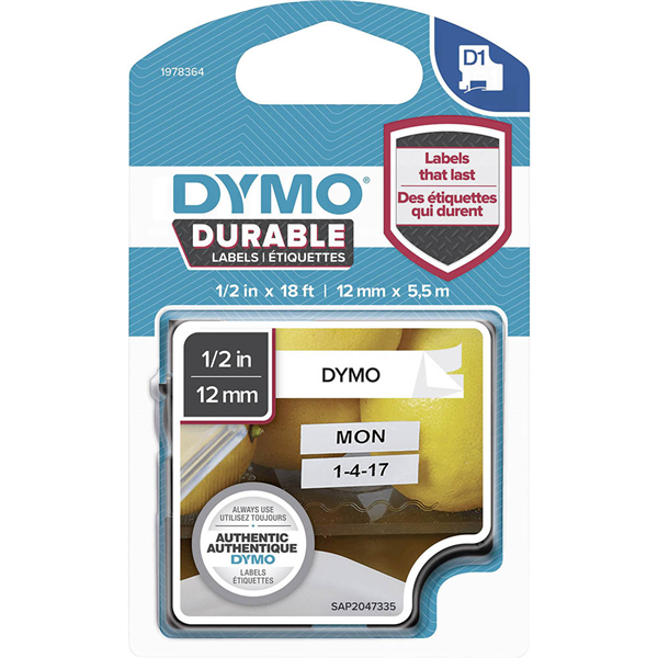 DYMO 1978364 D1 DURABLE LABEL CASSETTE TAPE 12MM X 5.5M BLACK ON WHITE