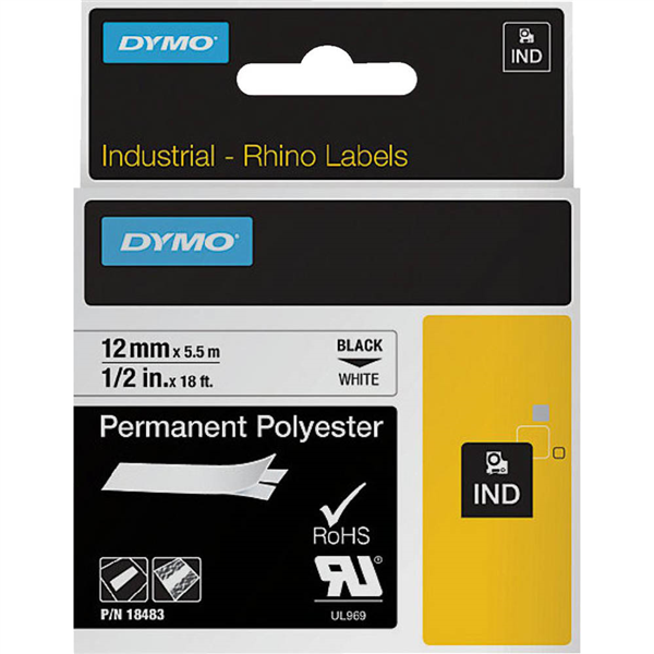 DYMO SD18483 RHINO INDUSTRIAL TAPE PERMANENT POLYESTER 12MM BLACK ON WHITE