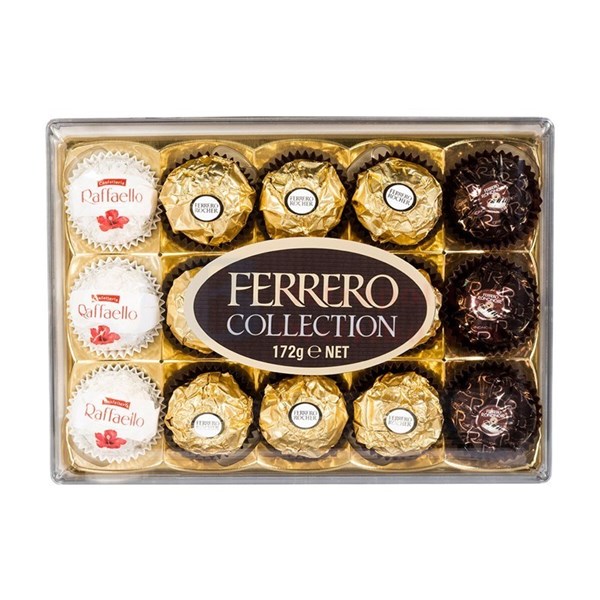 Selection of the finest Ferrero range Each chocolate is individually wrapped Includes Ferrero Rocher, Ferrero Rondnoir, and Raffaello Beautiful clear top box 172g Great gift idea!