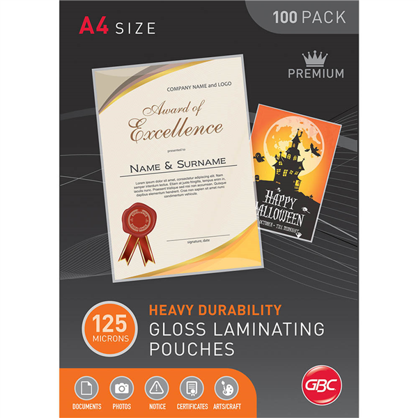GBC LAMINATING POUCH GLOSS 125 MICRON A4 CLEAR PACK 100