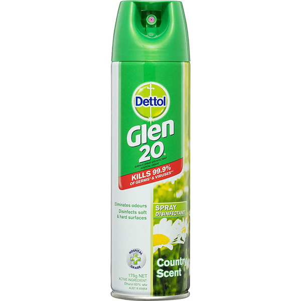 Dettol Glen 20 is fast, easy to use and effective Killing 99.9% of germs and viruses on hard and soft surfaces Killing the source of mould allergens and controlling the growth of mould and mildew on hard surfaces Eliminating odour causing bacteria to leave your home smelling fresh and clean Dettol Glen 20 gets to the source of the odour without heavy perfume and eliminates damp musty odours in areas where air does not circulate Ordinary non-germicidal sprays cant do this Dettol Glen 20 Spray Disinfectant kills the following germs and viruses including E.coli Salmonella choleraesuis Aspergillus niger (Mould and Mildew)(on hard surfaces only) Trichophyton mentagrophytes (Athletes foot fungus) Staphylococcus aureus Pseudomonas aeruginosa Streptococcus pyogenes Rhinivirus Type 37 (a leading cause of the common cold) Influenza Type A (H1N1) Poliovirus(on hard surfaces only) Rotavirus SA11 Adenovirus(on hard surfaces only) Avian Flu Virus Herpes Simplex Virus Type 1 and 2