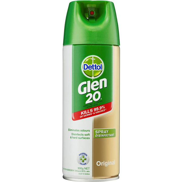 Dettol Glen 20 is fast, easy to use and effective Killing 99.9% of germs and viruses on hard and soft surfaces Killing the source of mould allergens and controlling the growth of mould and mildew on hard surfaces Eliminating odour causing bacteria to leave your home smelling fresh and clean Dettol Glen 20 gets to the source of the odour without heavy perfume and eliminates damp musty odours in areas where air does not circulate Ordinary non-germicidal sprays cant do this Dettol Glen 20 Spray Disinfectant kills the following germs and viruses including E.coli Salmonella choleraesuis Aspergillus niger (Mould and Mildew)(on hard surfaces only) Trichophyton mentagrophytes (Athletes foot fungus) Staphylococcus aureus Pseudomonas aeruginosa Streptococcus pyogenes Rhinivirus Type 37 (a leading cause of the common cold) Influenza Type A (H1N1) Poliovirus(on hard surfaces only) Rotavirus SA11 Adenovirus(on hard surfaces only) Avian Flu Virus Herpes Simplex Virus Type 1 and 2