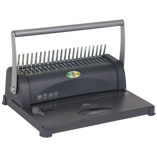 Small in size big on function the GS12 is easy to use and will bind a 350 page document, it also has the added feature of a 4 hole punch suitable for ring bingers Punches up to 12 sheets Binds up to 350 sheets Ergonomic handle Easy to use Incorporated 4 hole punch Large waste draw Compatible with A4 21 loop plastic binding combs 2 year warranty