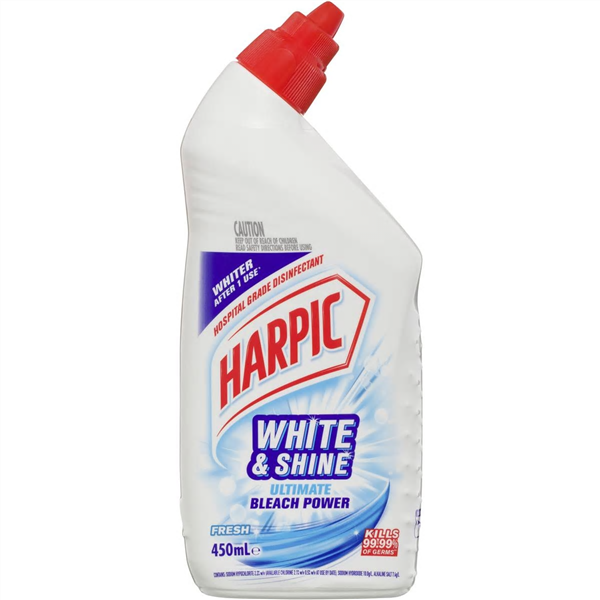 Harpic White & Shine Ultimate Bleach Power is a hospital grade disinfectant that kills 99.9% of germs for a sparkling white shine White & Shine Ultimate Bleach Power Deeply cleans and freshens, leaving your toilet bowl whiter after 1 use (vs soiled surface prior product application)