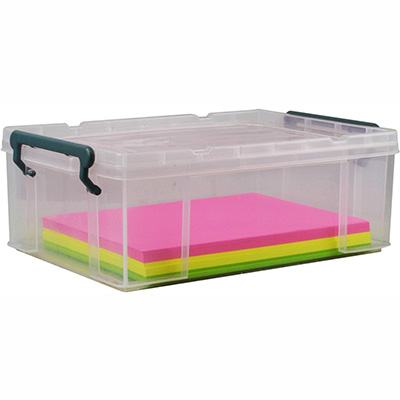 Strong and sturdy plastic construction Designed to stack to offer multiple combinations of a modular storage system Complete with handles to securely close lid to box Carry handles for easy mobility Made from transparent material for easy viewing of contents Made from food contact grade polypropylene material Designed for multi storage use applications - office, kitchen, warehouse 100% Australian Made