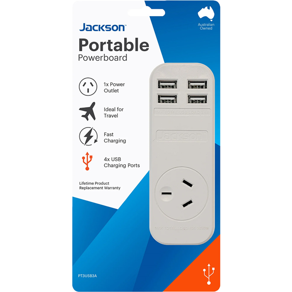JACKSON POWERBOARD SINGLE OUTLET 4 USB OUTLETS 900MM WHITE