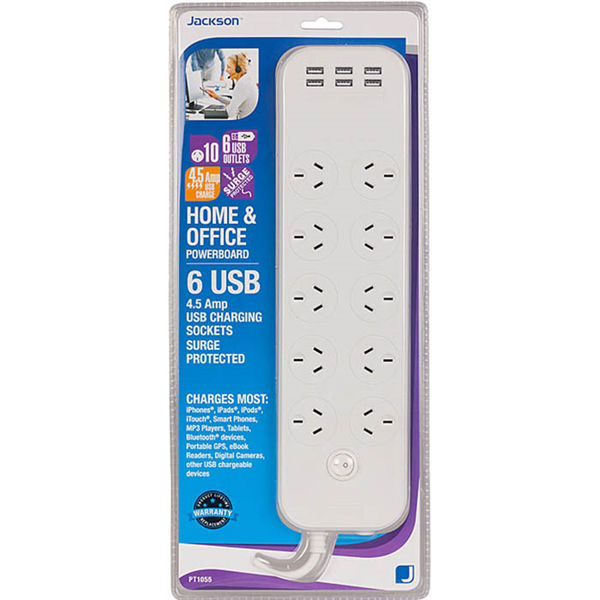 JACKSON POWERBOARD SURGE PROTECTED 10 OUTLET SWITCHED 6 USB OUTLETS 1M WHITE