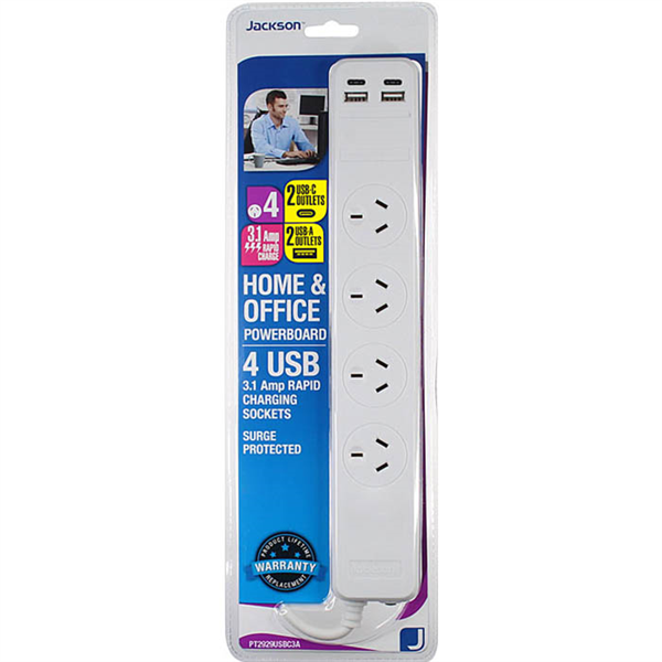 JACKSON POWERBOARD SURGE PROTECTED 4 WAY USB 1M WHITE
