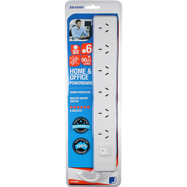JACKSON POWERBOARD SURGE PROTECTED 6 OUTLET SWITCHED 900MM WHITE