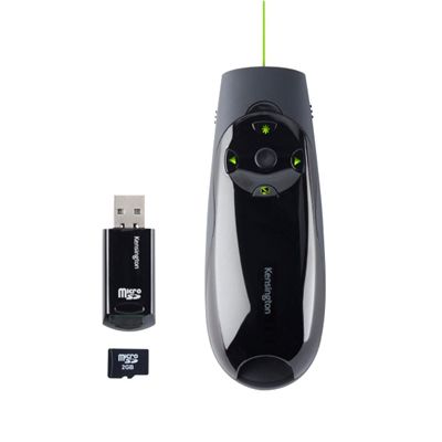 The presenter stores your PowerPoint or Keynote files on the 4GB Micro SD card that fits into the wireless USB receiver With a simple flick of a switch, you toggle between presentation and cursor control modes Make your point with a green laser thats 10 times brighter than standard red lasers, ideal for bigger rooms and LED/LCD screens The highly reliable 2.4GHz receiver resists device interference and gives you control from up to 50 metres away 4GB Micro SD card stores presentations, fits inside wireless receiver Cursor control joystick lets you use the presenter like a mouse, moving cursor up/down and left/right Green laser pointer is 10x brighter than a red laser so can make your point on LCD/LED screens Backlit button controls move slides forward/back, black out screen and activate the green laser pointer Extended 50 metre wireless range to roam the room Internal storage for wireless USB receiver so it wont get lost Plug and Play 2.4GHz USB wireless connection Comfortable grip with special contours for the hand Compatible with Windows 10, 8.1, 8, 7 and Mac OS X