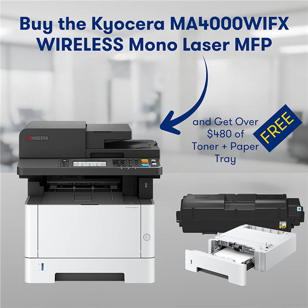 Offering super-fast printing speeds and excellent output quality This all-rounder is designed to keep up with the demands of large organisations, supporting Wi-Fi Direct for optimal flexibility Purchase a Kyocera MA4000WIFX and receive a bonus PF-1100 (valued at $259) and TK-1274 (valued at $228)