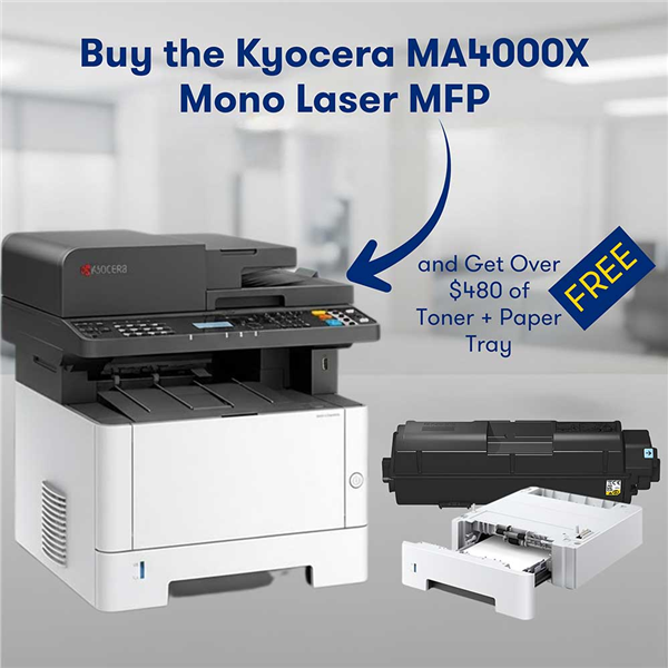 Offering super-fast printing speeds and excellent output quality This all-rounder is designed to keep up with the demands of large organisations, supporting Wi-Fi Direct for optimal flexibility Black and white colour Purchase a Kyocera MA4000X and receive a bonus PF-1100 (valued at $259) and TK-1274 (valued at $228)