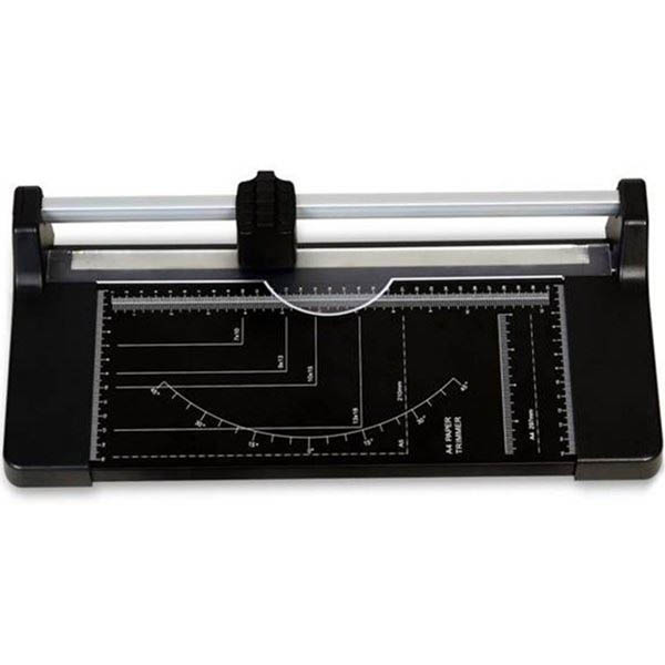 Strong and sturdy solid metal cutting base Ergonomic replaceable cutting head Transparent hand guard clamps on to paper while cutting Scale marking with DIN paper sizes Cutting capacity: 10 sheets (80gsm) 1 year warranty