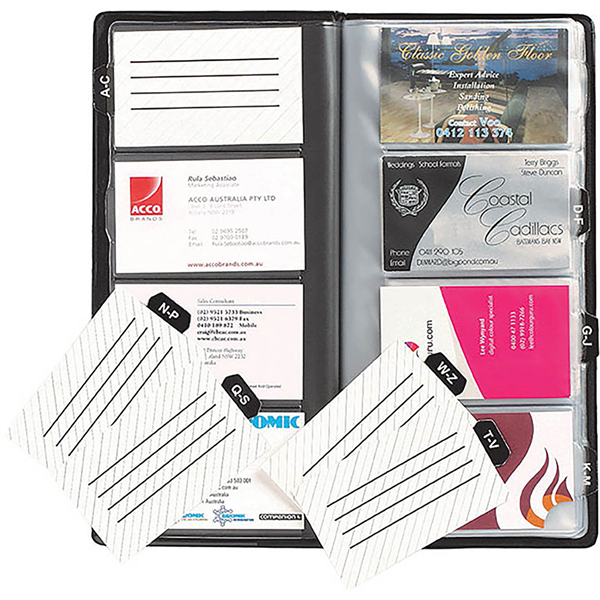 Slimline business card book fits easily into your briefcase or bag so your contacts are always at hand Long lasting plastic pages protect and store your business cards 96 Indexed business cards 255 x 125mm