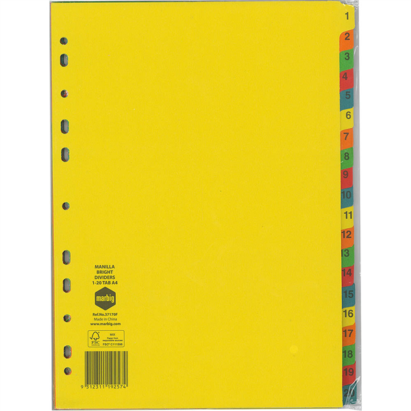MARBIG DIVIDER MANILLA 1-20 TAB A4 BRIGHT ASSORTED