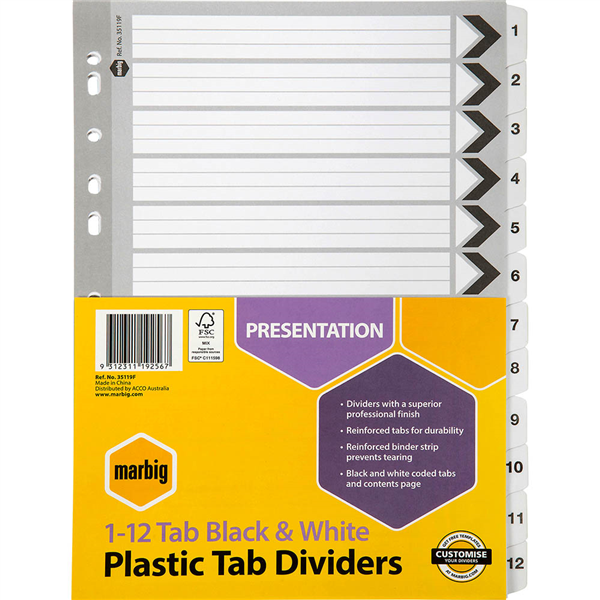 Marbig dividers are made from reinforced manilla board with plastic reinforced tabs and binder strips for durability and longer life