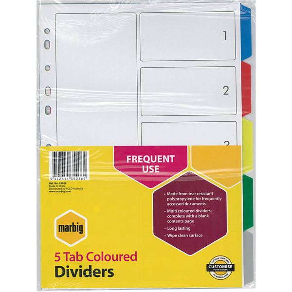 Marbig multicoloured divider is ideal for regular use as the strong polypropylene allows files to be frequently accessed whilst maintaining appearance and they wont break or tear with constant use