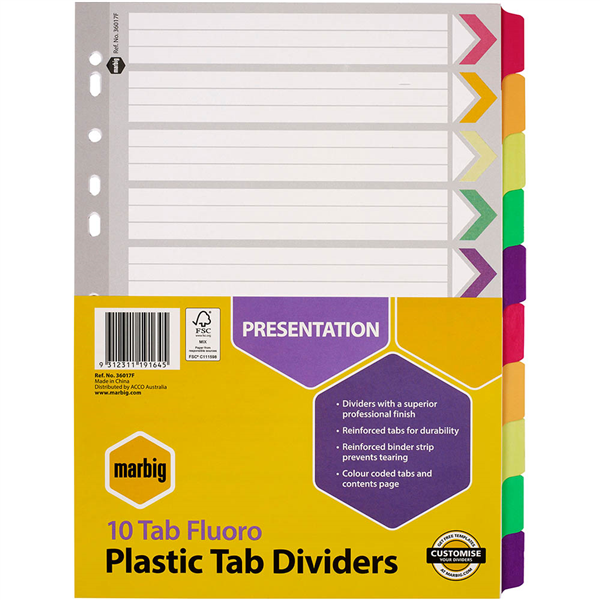 Marbig dividers are made from reinforced manilla board with plastic reinforced tabs and binder strips for durability and longer life