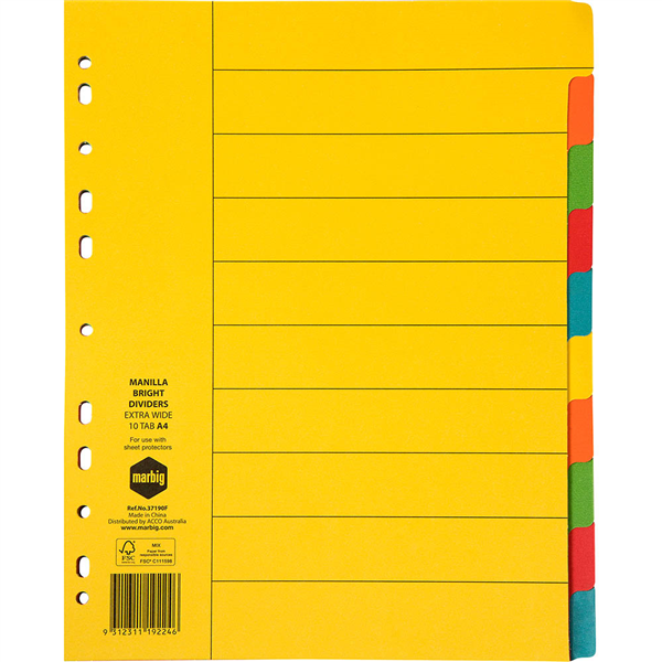 MARBIG EXTRA WIDE DIVIDER MANILLA 10-TAB A4 BRIGHT ASSORTED