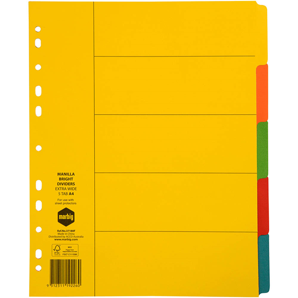 MARBIG EXTRA WIDE DIVIDER MANILLA 5-TAB A4 BRIGHT ASSORTED